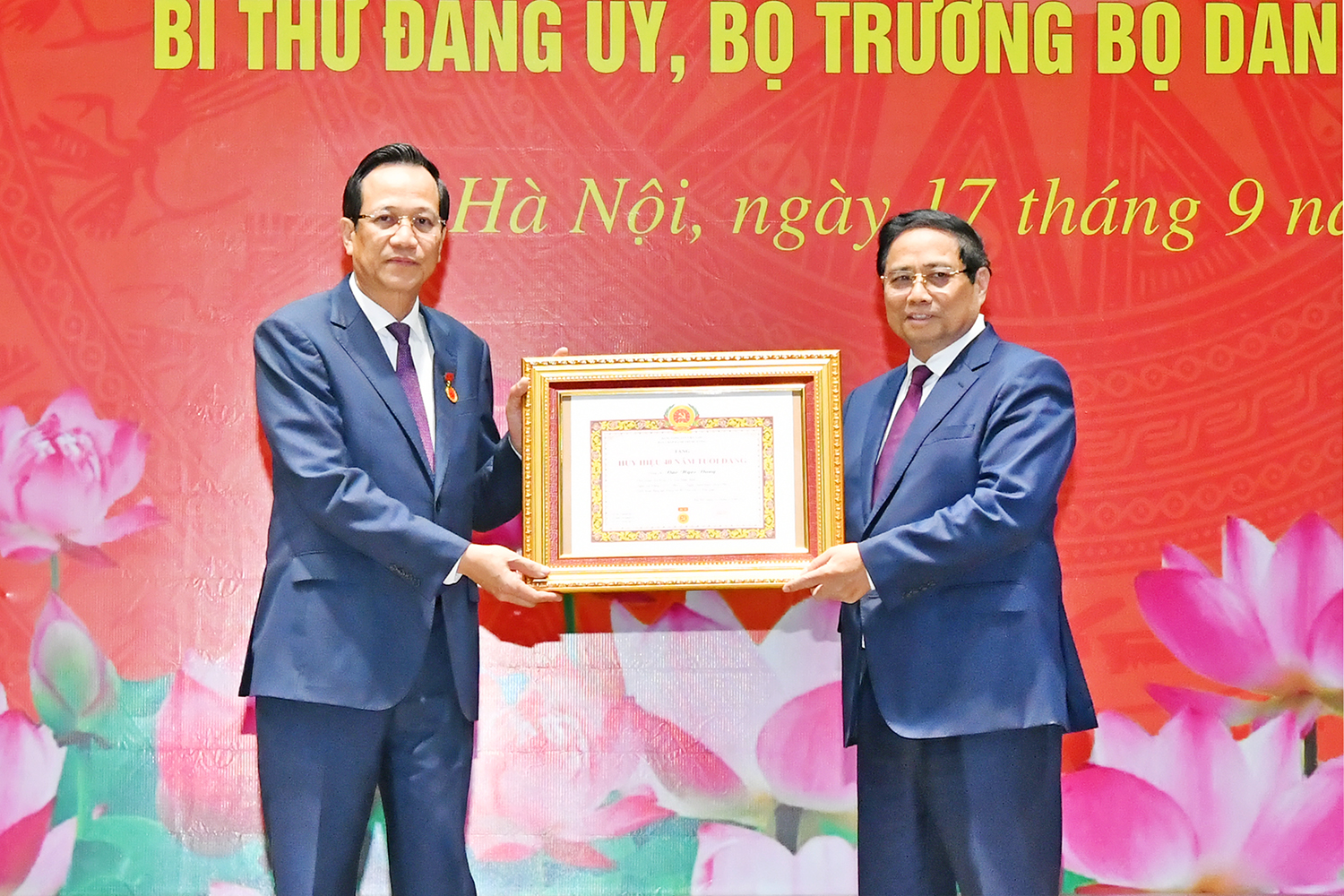 Ngày 17/9, tại Thủ đô Hà Nội, Đảng bộ Bộ Dân tộc và Tôn giáo long trọng tổ chức Lễ trao Huy hiệu 40 năm tuổi Đảng cho đồng chí Đào Ngọc Dung, Ủy viên Ban Chấp hành Trung ương Đảng, Ủy viên Ban Chấp hành Đảng bộ Chính phủ, Bí thư Đảng ủy, Bộ trưởng Bộ Dân tộc và Tôn giáo. Ủy viên Bộ Chính trị, Bí thư Đảng ủy Chính phủ, Thủ tướng Chính phủ Phạm Minh Chính tham dự buổi Lễ.